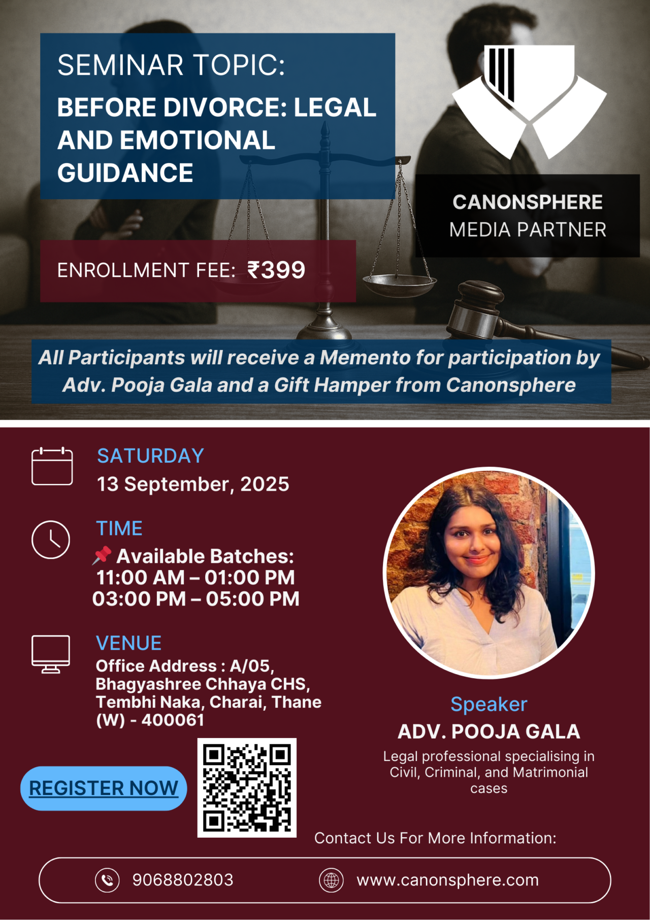 BEFORE DIVORCE: LEGAL AND EMOTIONAL GUIDANCE (SEMINAR BY ADV. POOJA GALA)September 3, 2025by canonsphere This listing has been expired.
