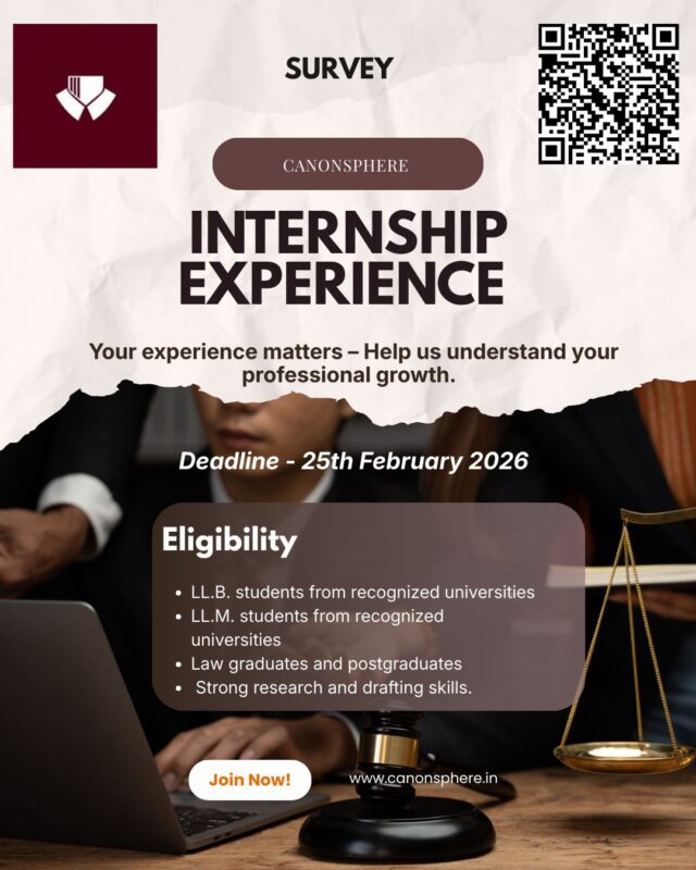Canonsphere is conducting a survey on Law Students’ Internship Experience Mapping to gather insights on internships pursued outside Canonsphere. The survey aims to bridge the gap between legal education and practical exposure, identifying challenges, opportunities, and expectations in the legal internship ecosystem. The information collected will help understand how students find internships, identify institutions offering opportunities, recognize skill gaps, and design better training programs. This academic and research-oriented survey seeks to create a transparent picture of internship accessibility and quality, contributing to a structured guidance system for future law students.